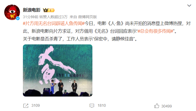 紧接着,王一博的粉丝胜仗问:电影《东说念主鱼》究竟是拍完收场了,照旧莫得拍摄,从百科上看,这部电影商酌在2023年6月开机,当话题询查度越来越高的技巧,有东说念主向片方求证,对方借用《无名》的台词恢复默示:“总会有能多听说”,对于电影是否收场了,责任主说念主员默示:“守秘中,请静候喜信。”